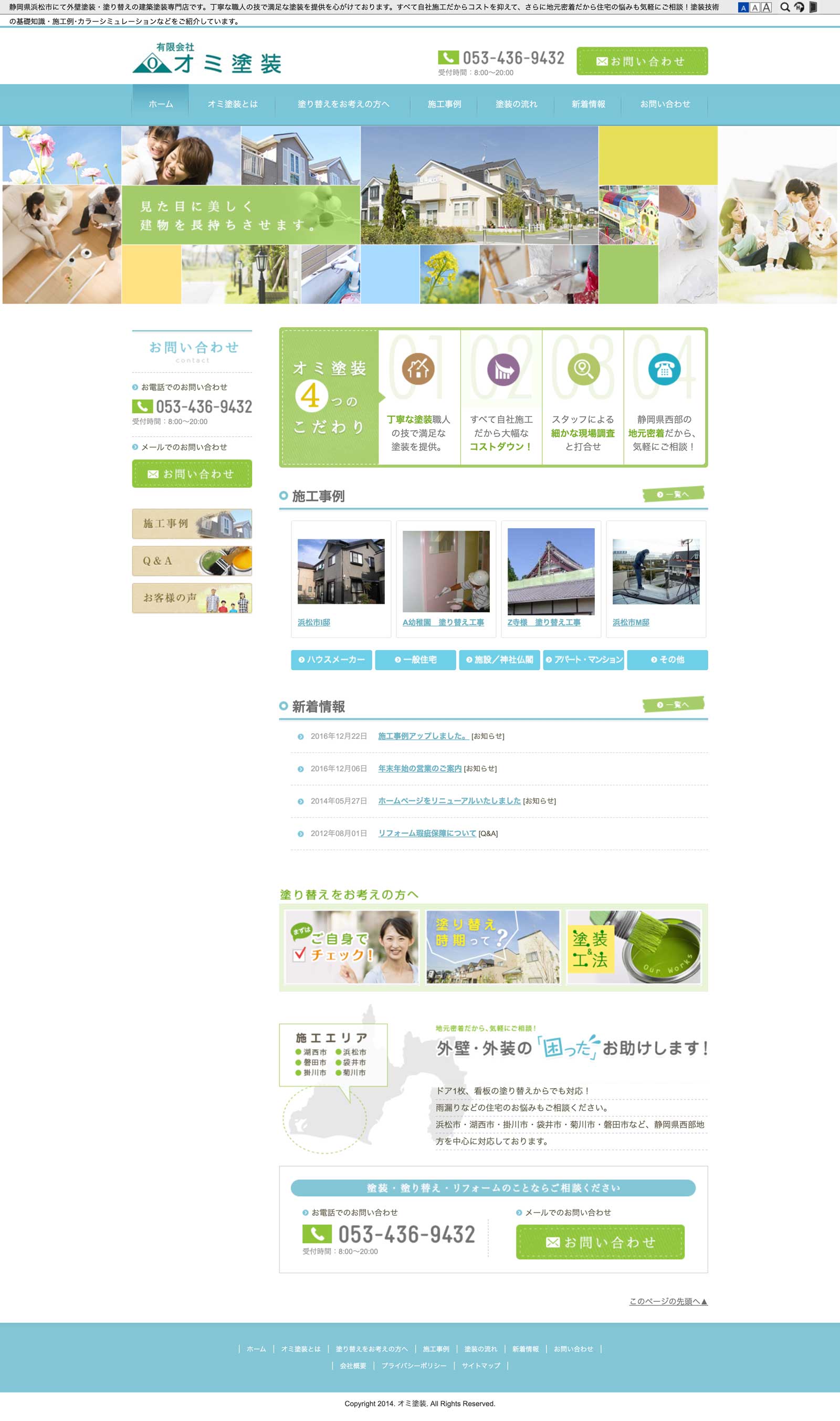 静岡県浜松市の外壁塗装・リフォーム塗り替え・建築塗装専門店です。塗装技術の基礎知識・施工例・カラーシミュレーションなどを御紹介しています。有限会社 オミ塗装 様のウェブサイト
